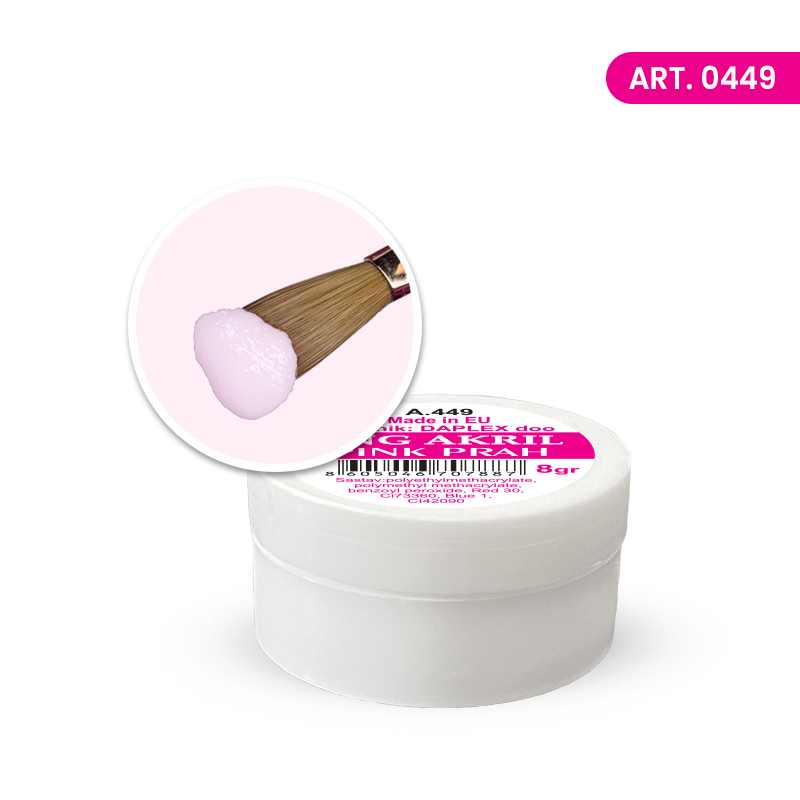Akrilni prah prozirno pink za nadogradnju i izlivanje noktiju.  Lak za rad, srednje brzine stvrdnjavanja. Koristi se sa Extra nail liquid-om. Samo za profesionalnu upotrebu. Zemlja uvoza: Holandija, EU. Uvoznik: "Daplex" doo, Beograd