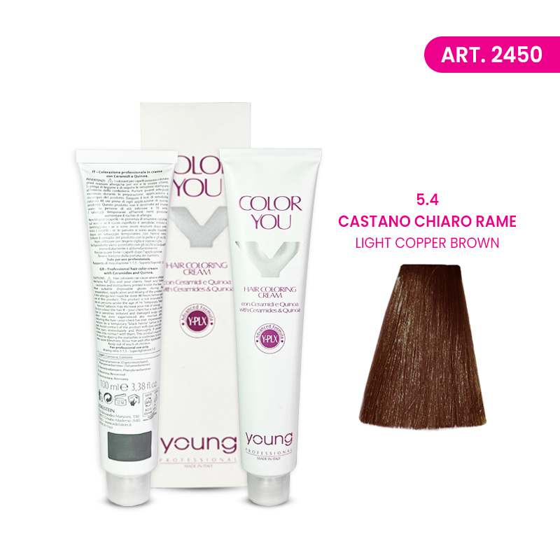Young italijanska farba sa ceramidima za kosu No.5.4 Castano chiaro rame - Light copper brown. Pakovanje farbe je 100 ml. Meša se sa 1:1,5 ml hidrogena (na 100 ml farbe ide 150 ml hidrogena ili 50 ml farbe sa 75 ml hidrogena). Zemlja porekla: Italija  *Važna napomena za Young farbe i celu kolekciju  rađene za EU tržište. Kvalitet farbi kod nas i u EU je isti. Nema razlike u kvalitetu proizvoda. Zato su svi oduševljeni sa ovim farbama i svim proizvodima iz ove kolekcije. Kosa je sjajna i negovana. U YOUNG kolekciji postoje i toneri/korektori, i najnovije fenomenalni blanš 9 tonova!
