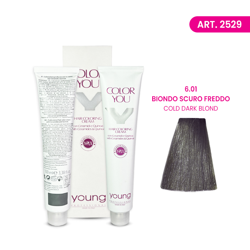 Young italijanska farba sa ceramidima za kosu No.6.01 Biondo scuro freddo - Cold dark blond. Pakovanje farbe je 100 ml. Meša se sa 1:1,5 ml hidrogena (na 100 ml farbe ide 150 ml hidrogena ili 50 ml farbe sa 75 ml hidrogena). Zemlja porekla: Italija  *Važna napomena za Young farbe i celu kolekciju  rađene za EU tržište. Kvalitet farbi kod nas i u EU je isti. Nema razlike u kvalitetu proizvoda. Zato su svi oduševljeni sa ovim farbama i svim proizvodima iz ove kolekcije. Kosa je sjajna i negovana. U YOUNG kolekciji postoje i toneri/korektori, i najnovije fenomenalni blanš 9 tonova!
