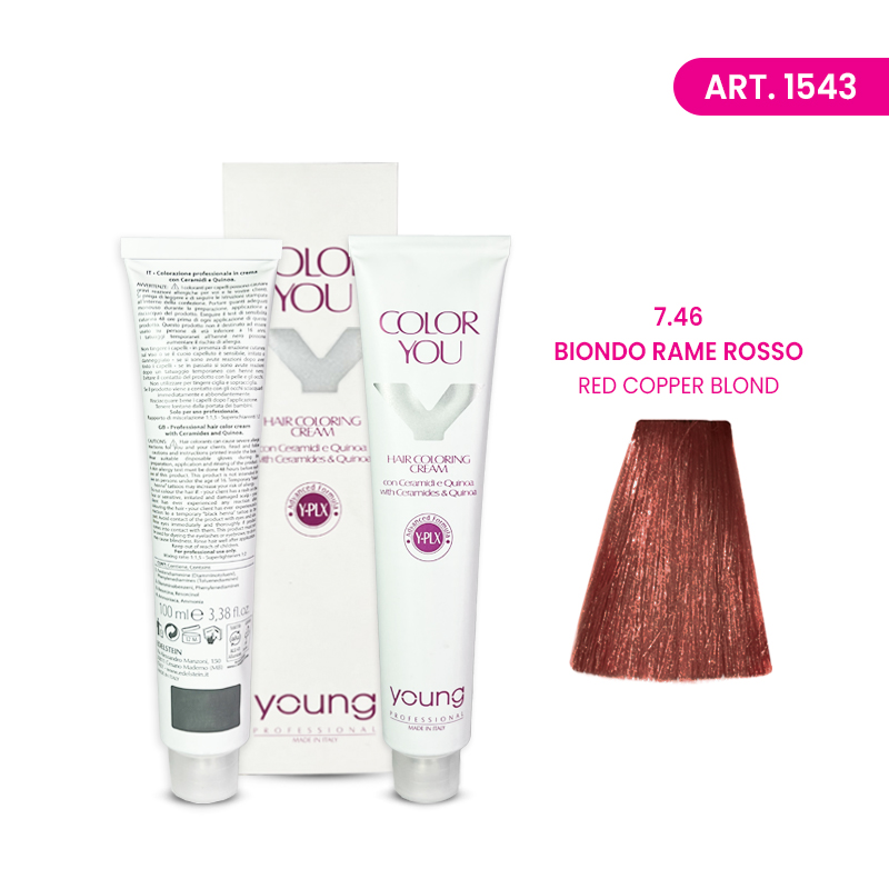 Young italijanska farba sa ceramidima za kosu No.7.46 Biondo rame rosso - Red copper blond. Pakovanje farbe je 100 ml. Meša se sa 1:1,5 ml hidrogena (na 100 ml farbe ide 150 ml hidrogena ili 50 ml farbe sa 75 ml hidrogena). Zemlja porekla: Italija  *Važna napomena za Young farbe i celu kolekciju  rađene za EU tržište. Kvalitet farbi kod nas i u EU je isti. Nema razlike u kvalitetu proizvoda. Zato su svi oduševljeni sa ovim farbama i svim proizvodima iz ove kolekcije. Kosa je sjajna i negovana. U YOUNG kolekciji postoje i toneri/korektori, i najnovije fenomenalni blanš 9 tonova!