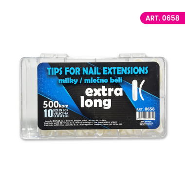 Tipse za nadogradnju noktiju. Extra long. 500kom u pakovanju, 10 razli;itih veličina. Mlečno beli.