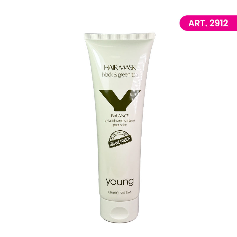 YOUNG maska sa crnim i zelenim čajem za negu farbane kose. Bogata antioksidansima, polifenolim i oligomineralima štiti kosu od oštećenja uzrokovanih hemikalijama i atmosferskim delovanjem, osržavajući je zdravom i vitalnom.  Zemlja porekla: Italija. Uvoznik i distributer: "Daplex" doo, Beograd